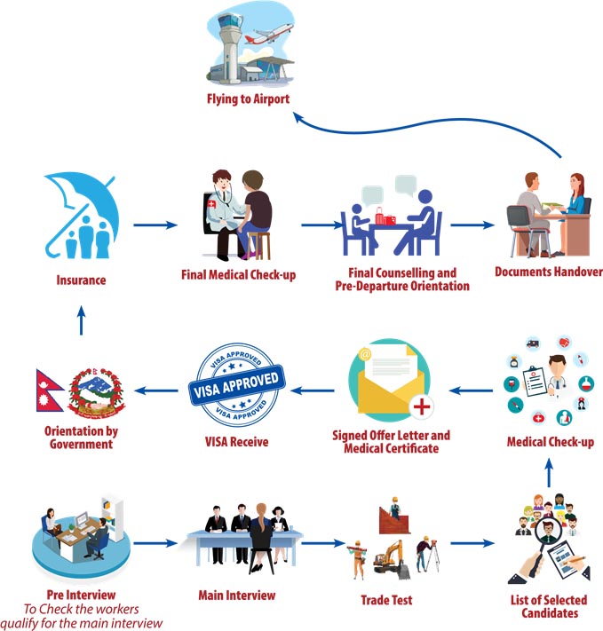 Prior to the departure of workers the orientation briefing is organized to make all workers fully aware of the employment company, country’s laws and orders, labor laws immigration policy and maintain understanding and cordiality them self and aim of the particular activity of the individual. The Orientation takes special care in briefing them to strictly abide by the guide lines in the field of their employment and direct them to maintain good circumstance and motivate them to their duties/responsibilities. - Travelling Arrangement